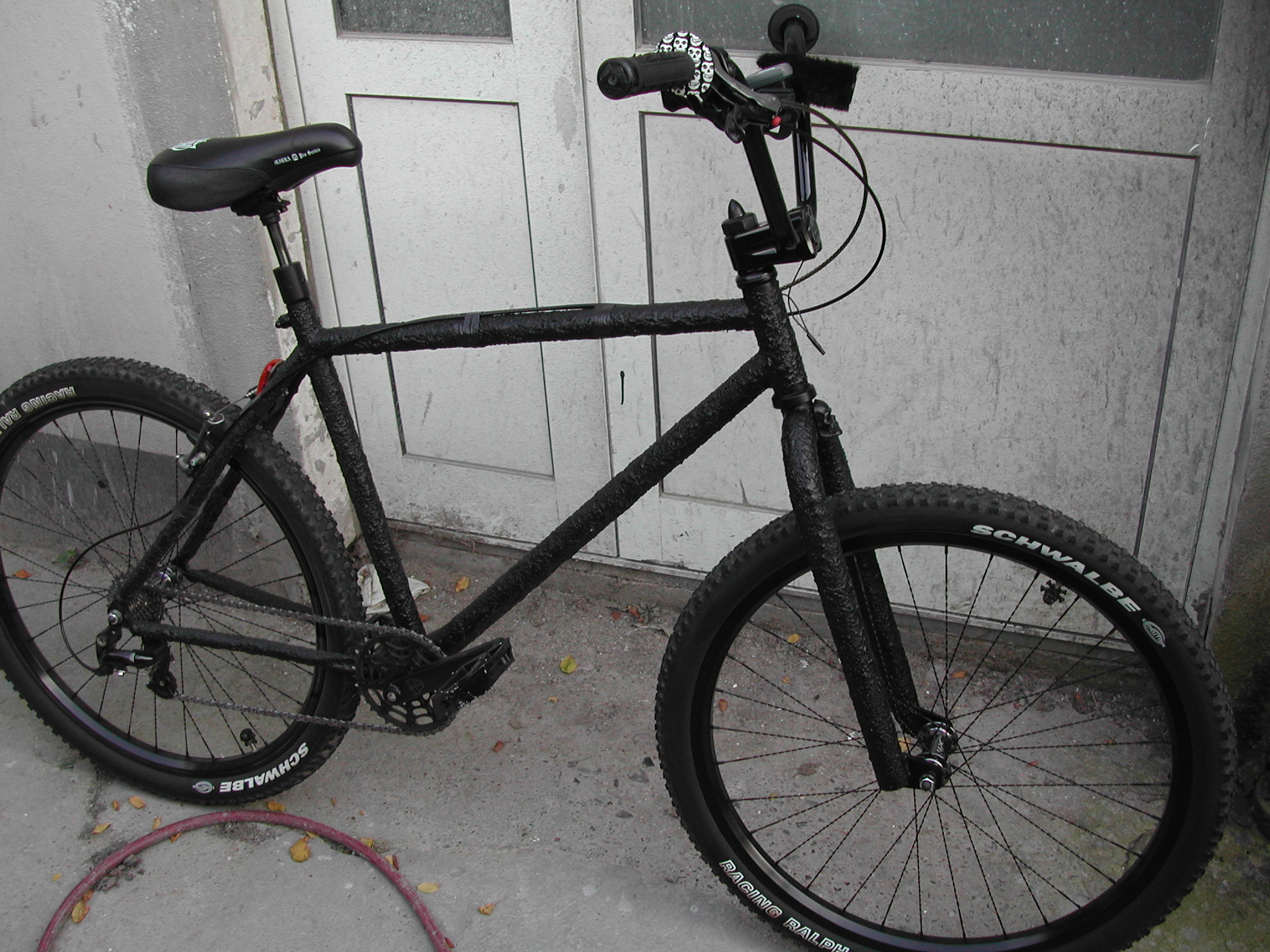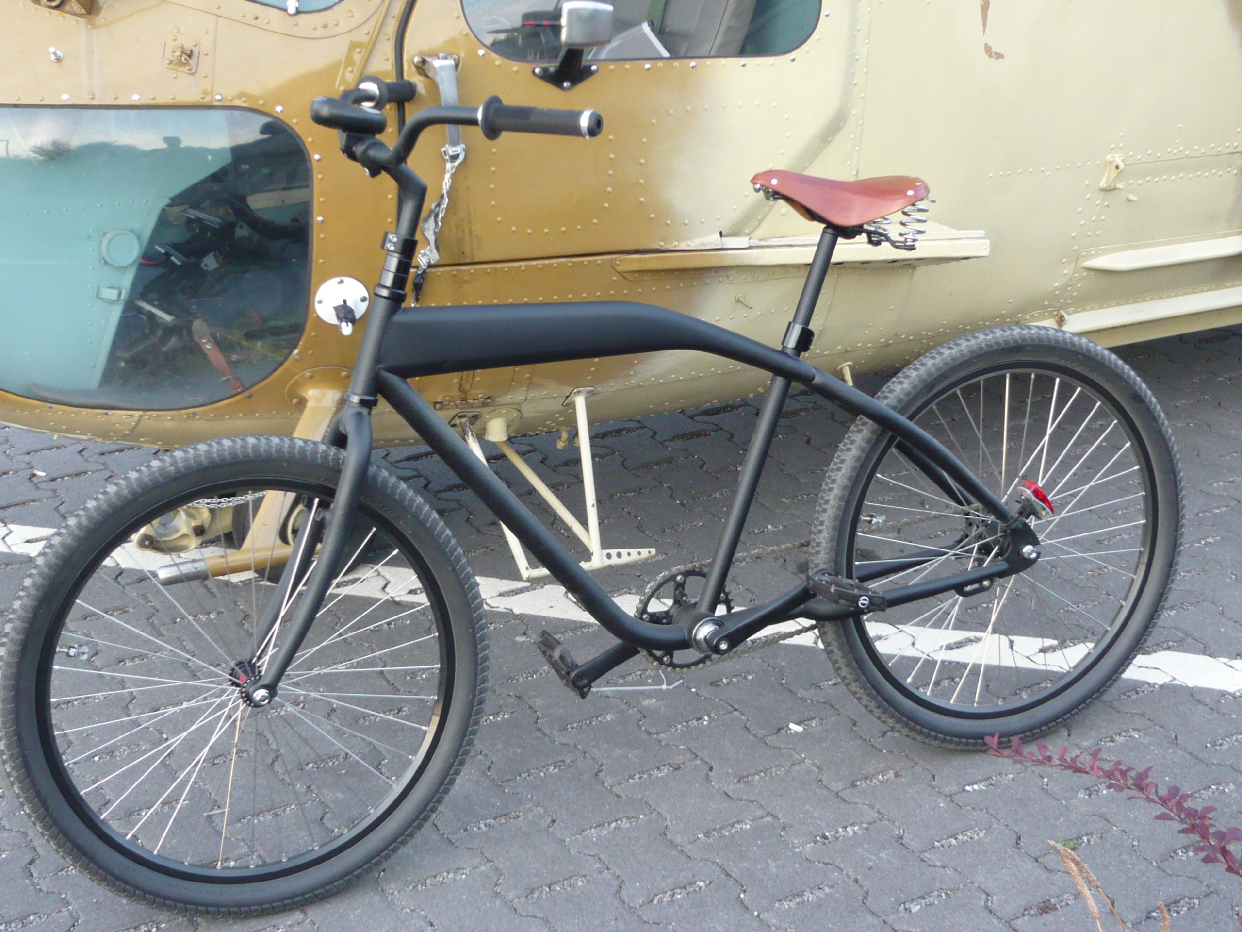 Sämtliche Anlötsockel vom Stahl-Rahmen entfernt, gesandstrahlt und schwarz pulverbeschichtet. Haro BMX Lenker, Dyno oldschool BMX Vorbau, Shimano STX Rennrad Steuersatz, S&M BMX Sattel, Shimano 105 Rennrad Kurbel, FSA Kettenblatt, Sun BFR Felgen, vorne Suntour oldschool BMX Nabe poliert, hinten F&S Torpedo 3-gang Rücktritt Nabe, Schwalbe Big apple Bereifung, Specialized Plattform Pedale. Aufbaukosten ca. 600 Euro. Der Rahmen ist multi kompatibel, von Singlespeed über Naben- bis Kettenschaltung und V-Brakes ist alles möglich. For sale!