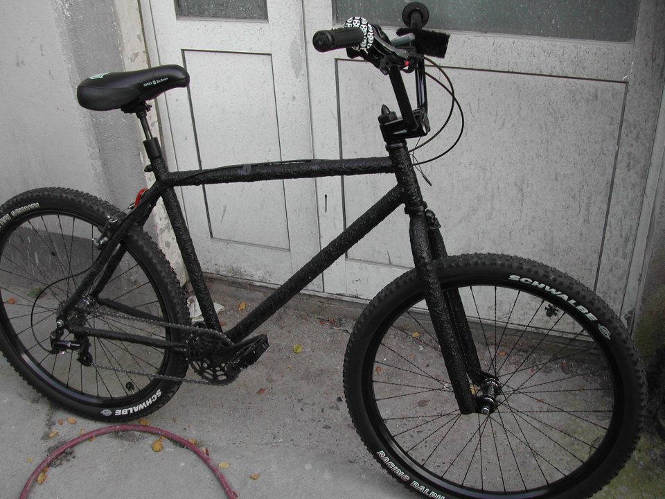 Alu-Rahmen mit Mosso Alu-Gabel, Scheibenbremsaufnahme entfernt, Hope Steuersatz, Atomlab Vorbau, S&M XLT BMX Lenker, XT V-Brakes mit custom BBooster, 105er RR Naben mit Mavic 717 Felgen. 10fach Ultegra Kassette, Dura Ace 7700 Schaltwerk mit Tacx Keramik Rollen, Road Schalthebel, polierte vintage XTR 900 Kurbel.