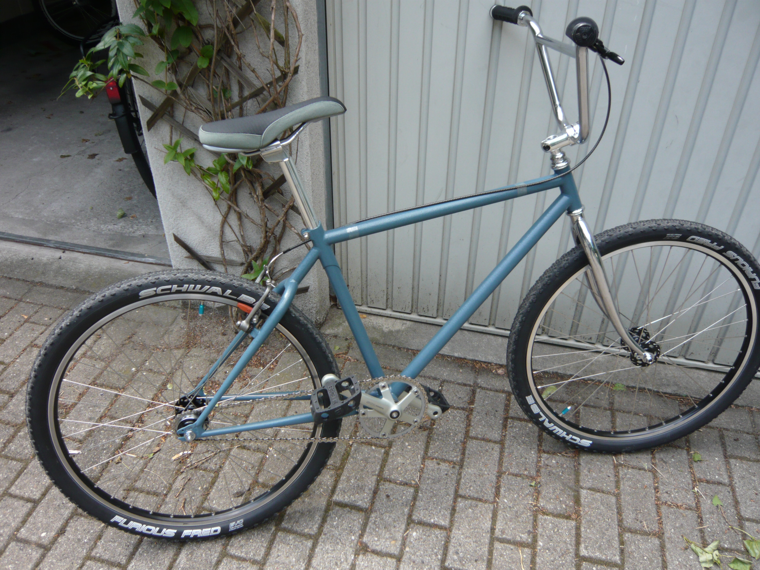 Sämtliche Anlötsockel vom Stahl-Rahmen entfernt, gesandstrahlt und schwarz pulverbeschichtet. Haro BMX Lenker, Dyno oldschool BMX Vorbau, Shimano STX Rennrad Steuersatz, S&M BMX Sattel, Shimano 105 Rennrad Kurbel, FSA Kettenblatt, Sun BFR Felgen, vorne Suntour oldschool BMX Nabe poliert, hinten F&S Torpedo 3-gang Rücktritt Nabe, Schwalbe Big apple Bereifung, Specialized Plattform Pedale. Aufbaukosten ca. 600 Euro. Der Rahmen ist multi kompatibel, von Singlespeed über Naben- bis Kettenschaltung und V-Brakes ist alles möglich. For sale!